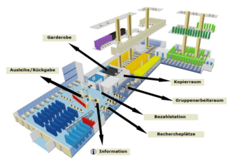 Aufgabenstellung: Im Rahmen der zu vergebenden Arbeit soll für den Altbau der Bibliothek ein Raumakustik Modell mit der Raumakustik-Software Raven© der RWTH-Aachen und Sketch Up erstellt werden. Die Bibliothek zählt im Sinne der DIN 18041 zu den großen Räumen der Raumgruppe B. Aufgrund der Nutzung als Raum zum längerfristigen Verweilen spricht die DIN 18041 hier von den Nutzungsarten B1, B2 und B3.