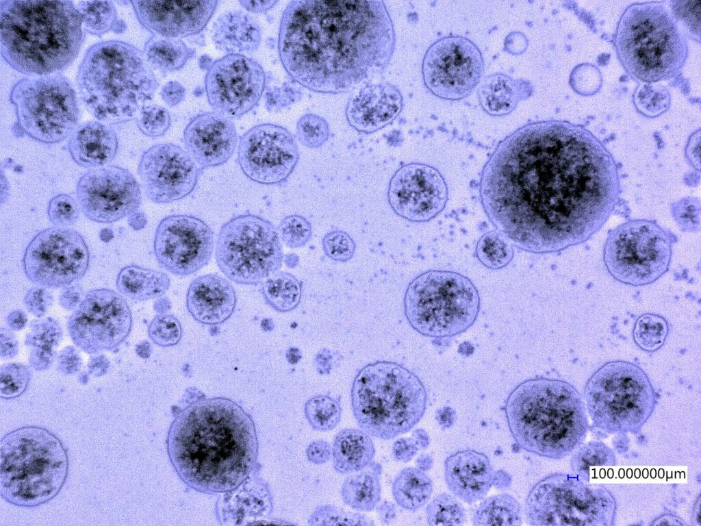 Optical light microscopy image (50X, high contrast) of sustainable, natural polysaccharide based, ascorbic acid loaded ‘green’ microcapsules for oralcare / cosmetic applications.